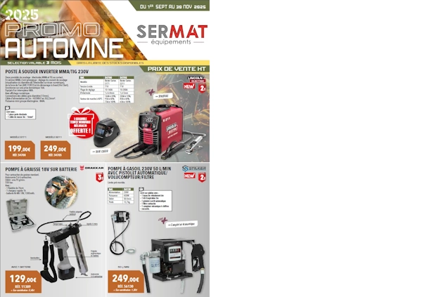 Catalogue Promo Catalogue Sodise automne Du 01/09/2025 au 30/11/2025 Téléphone 02 98 89 69 29 Adresse ZAE Croas An Heizic128 Impasse du marais29800 Saint-ThonanFrance Email info@sermat.bzh Suivez-nous Suivre